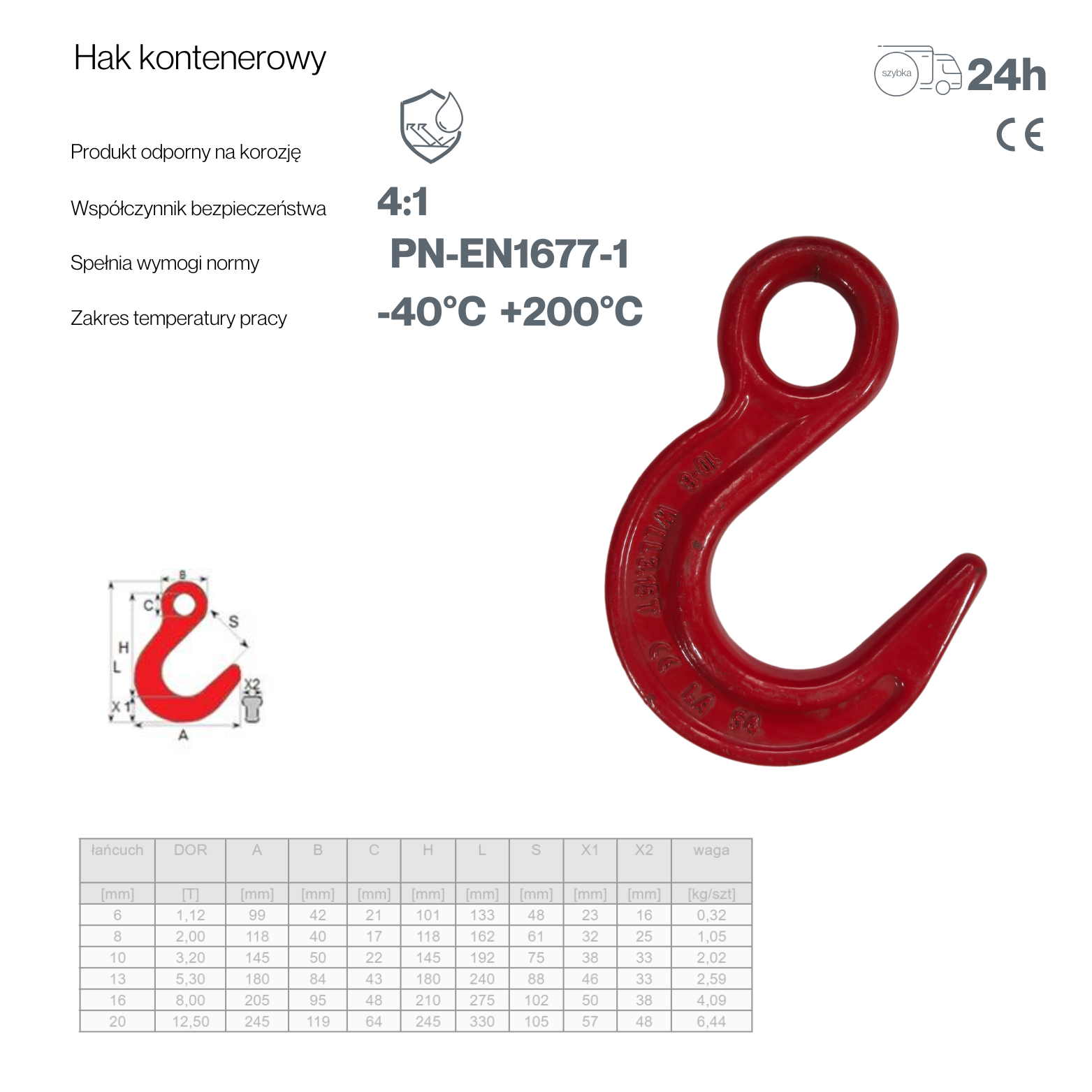 Hak kontenerowy PN-EN 1677-1 to profesjonalne rozwiązanie dla firm, które stawiają na bezpieczeństwo, trwałość i efektywność w procesach transportu i magazynowania. Dzięki zgodności z europejskimi standardami, użytkownik ma pewność, że korzysta z produktu o najwyższej jakości, który spełnia wszelkie normy bezpieczeństwa i wytrzymałości.