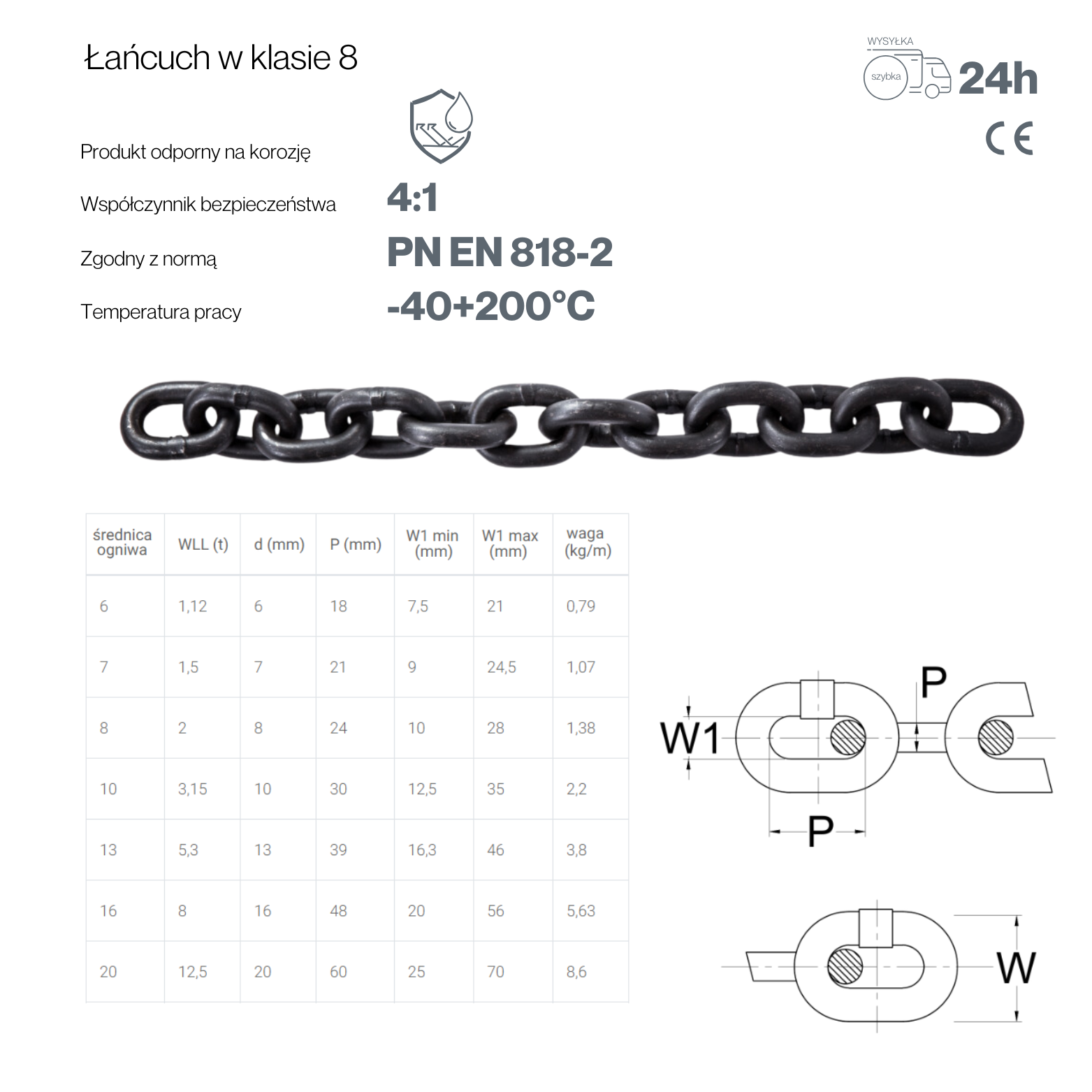 Łańcuch zawiesiowy, spełniający normę EN 818-2 oraz należący do Klasy 8, to zaawansowany produkt o najwyższej jakości, zaprojektowany z myślą o wymagających zastosowaniach w przemyśle ciężkim, budownictwie, logistyce, a także w sektorze transportowym. Wytwarzany z wysokowytrzymałej stali stopowej, która poddawana jest zaawansowanym procesom obróbki cieplnej, takim jak hartowanie, odpuszczanie oraz kontrolowane chłodzenie, łańcuch G80 cechuje się wyjątkową wytrzymałością mechaniczną, niezawodnością oraz odpornością na trudne warunki środowiskowe.