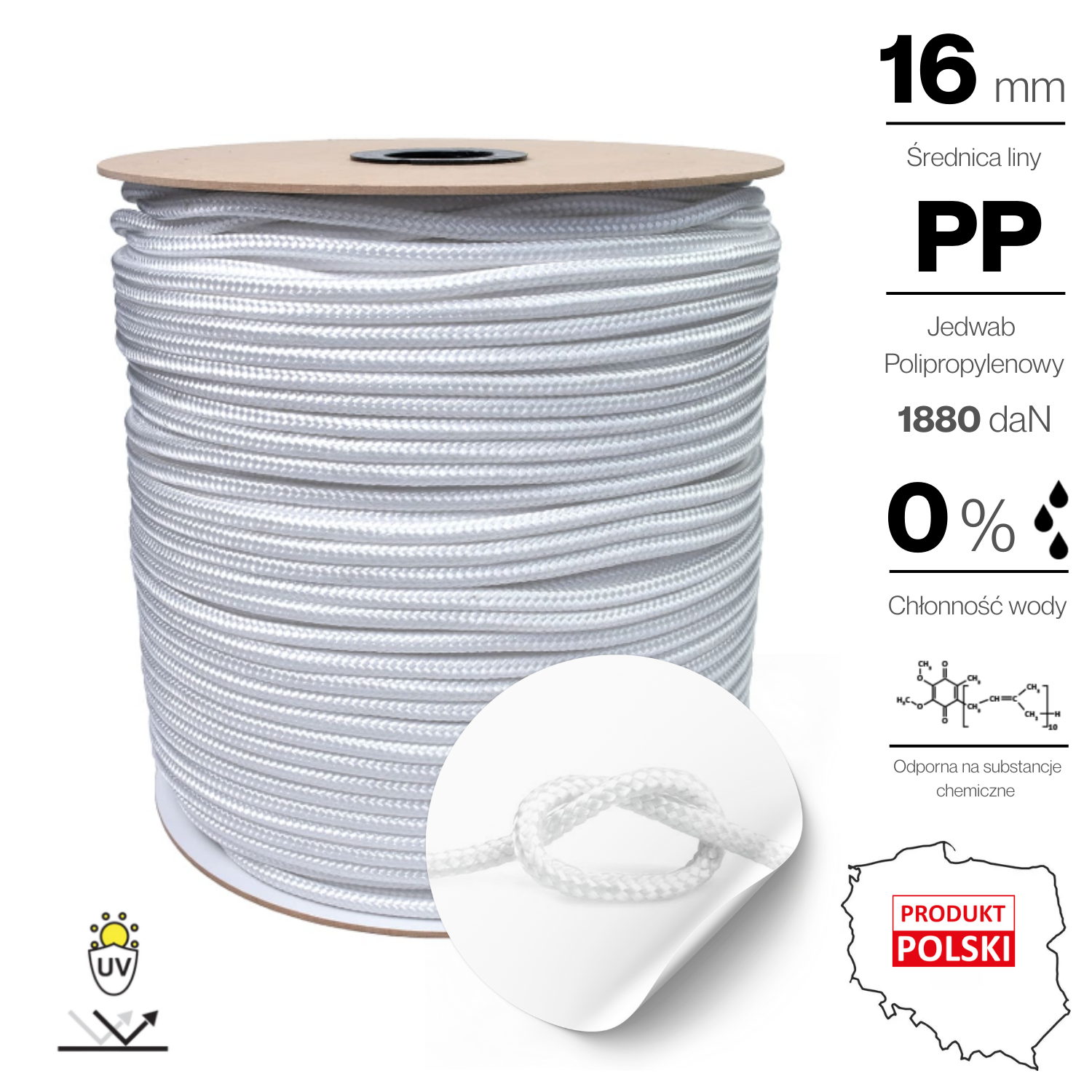 Lina Polipropylenowa Pleciona BIAŁA ø 16 mm wytrzymałość 1880 kg 1mb
