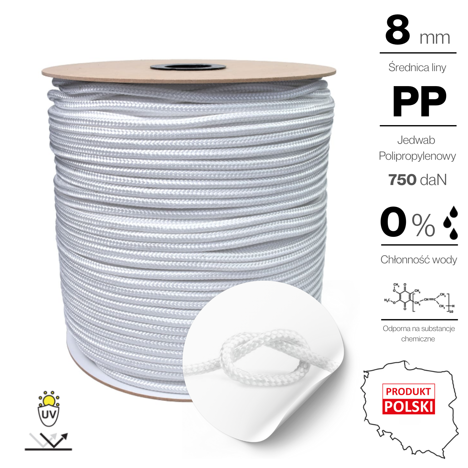 Lina Polipropylenowa Pleciona BIAŁA ø 8 mm wytrzymałość 750 kg 1mb