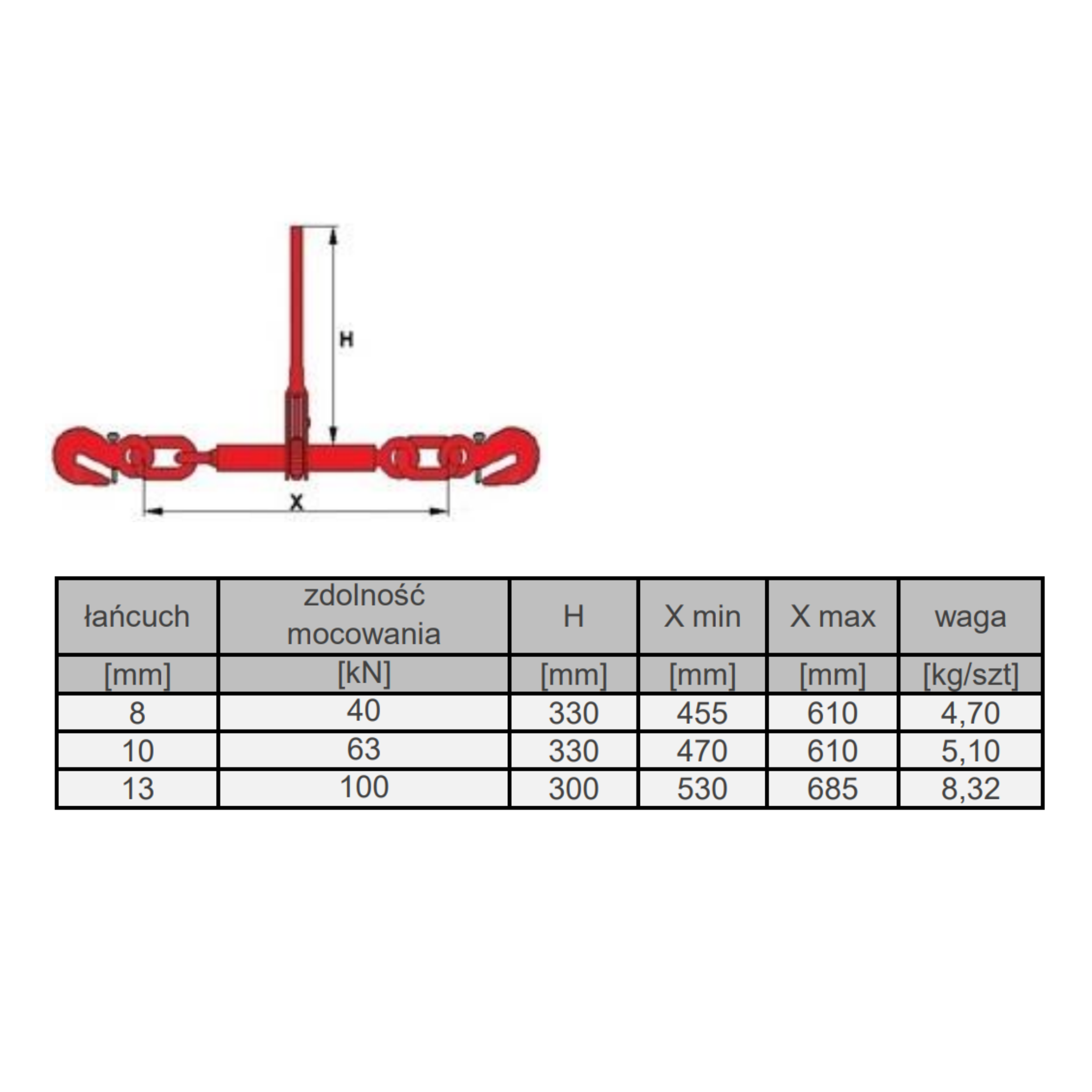 Zgodność z normą PN-EN 12195-3 gwarantuje, że napinacz spełnia wszystkie wymagane standardy jakości i bezpieczeństwa, zapewniając pewne mocowanie łańcuchów. Norma ta dotyczy urządzeń stosowanych do zabezpieczania ładunków, dzięki czemu napinacz sprawdzi się w różnych środowiskach pracy. -