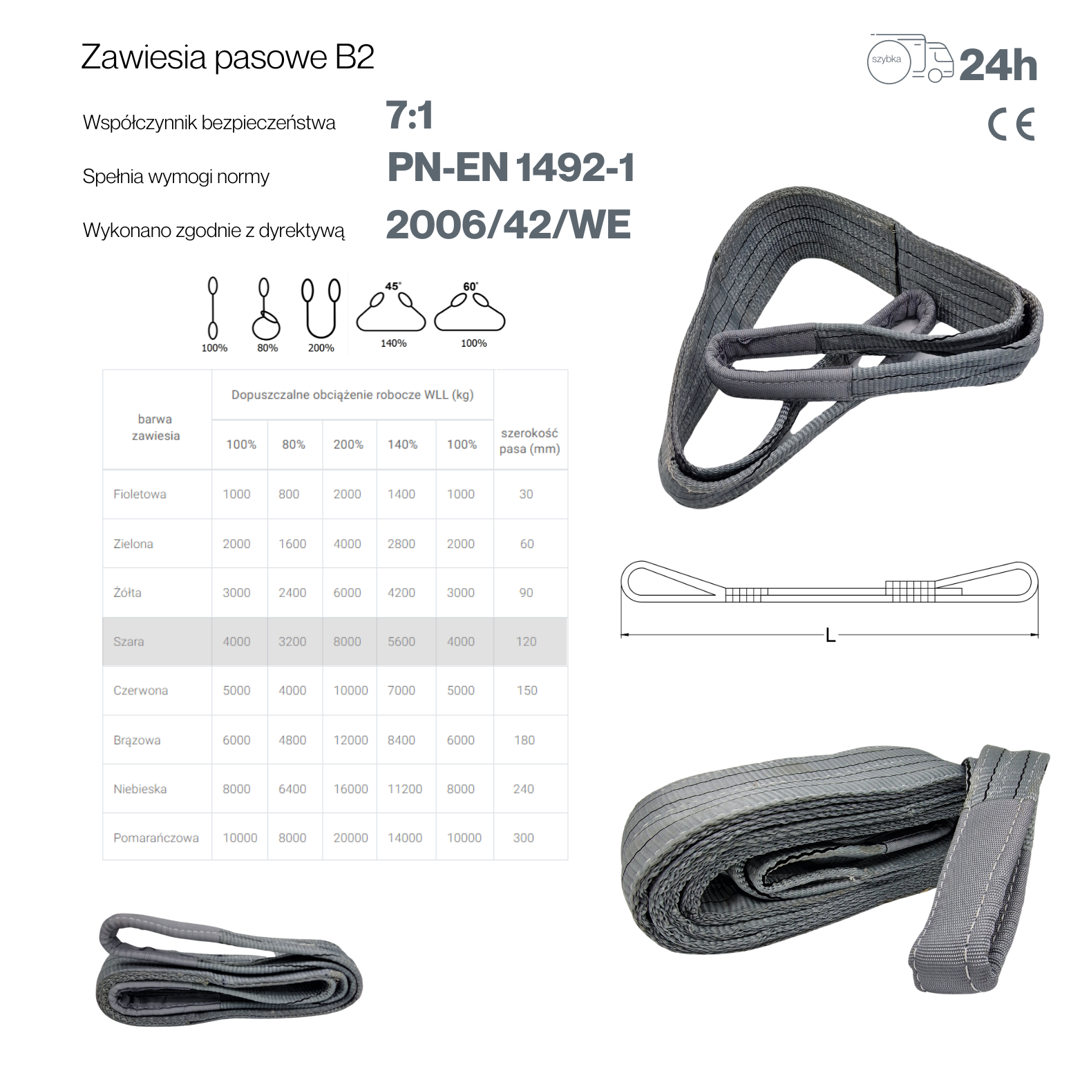 Zawiesie pasowe 4T 120mm 8,5 metra z pętlami typ B2