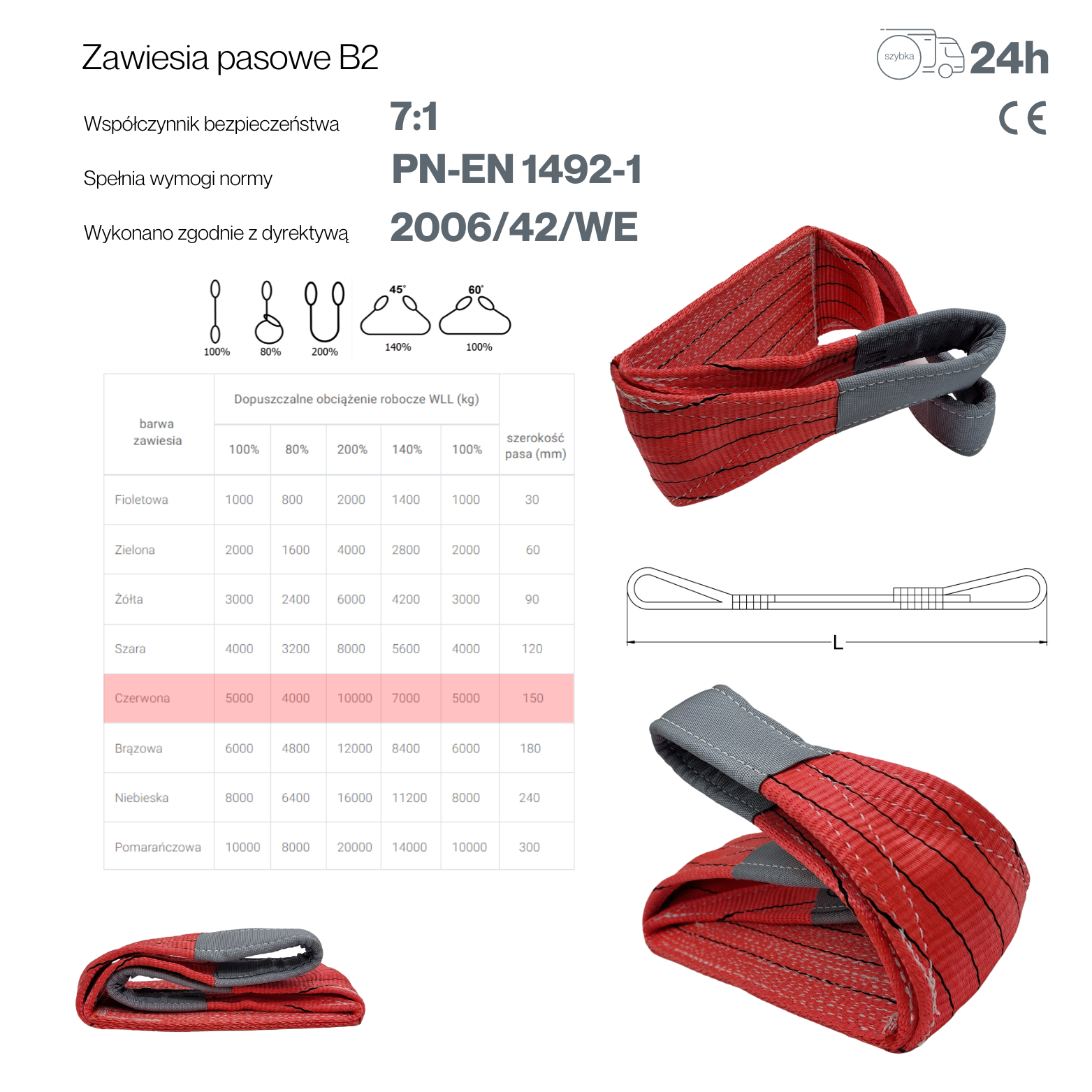 Zawiesie pasowe 5T 150mm 4,5 metra z pętlami typ B2
