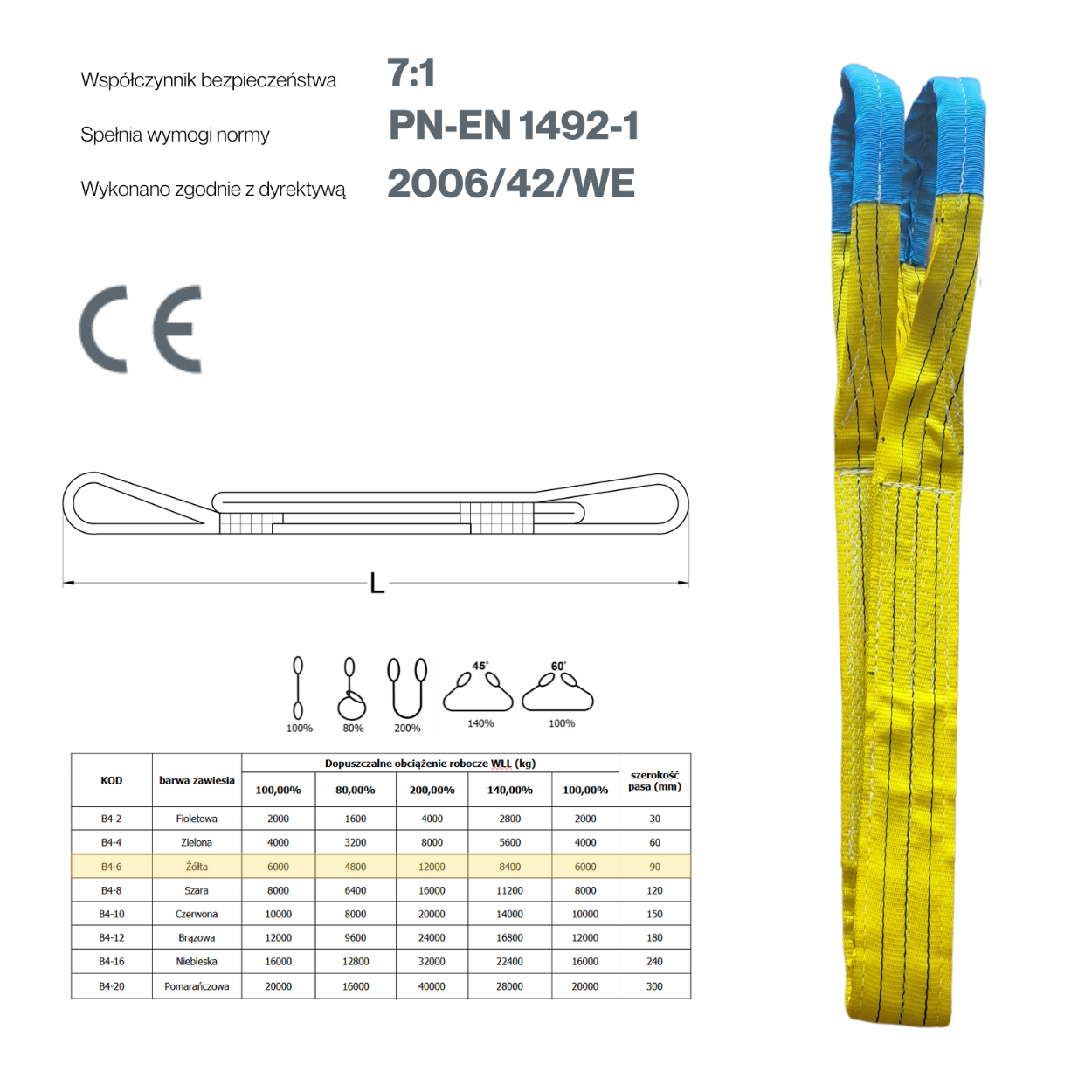 2. Bezpieczeństwo: Produkt spełnia normę PN-EN 1492-1, co gwarantuje, że zawiesie jest zgodne z europejskimi standardami bezpieczeństwa. Zawiesie jest wyposażone w etykietę identyfikacyjną zawierającą wszystkie niezbędne informacje, takie jak nośność, długość oraz data produkcji. Wysoki współczynnik bezpieczeństwa zapewnia, że zawiesie może być bezpiecznie używane przy nominalnym obciążeniu.