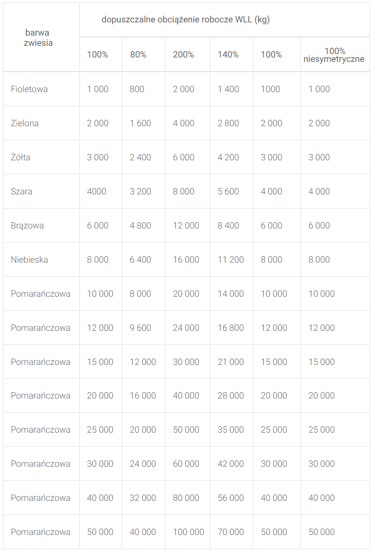 - Certyfikacja: Wszystkie zawiesia posiadają atesty potwierdzone Certyfikatem Jakości oraz metką zgodności z normą EN 1492-2:2000.